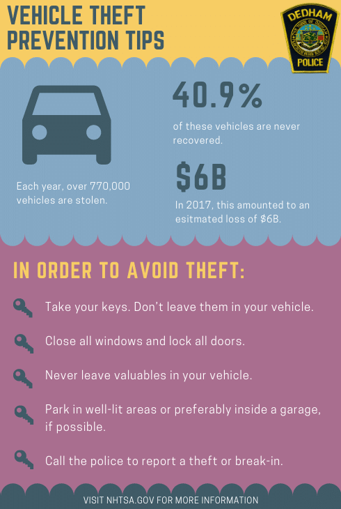 DEDHAM — Chief Michael D’Entremont and the Dedham Police Department would like to advise residents to properly secure their vehicles to prevent break-ins and avoid being easy targets for thieves this month.
