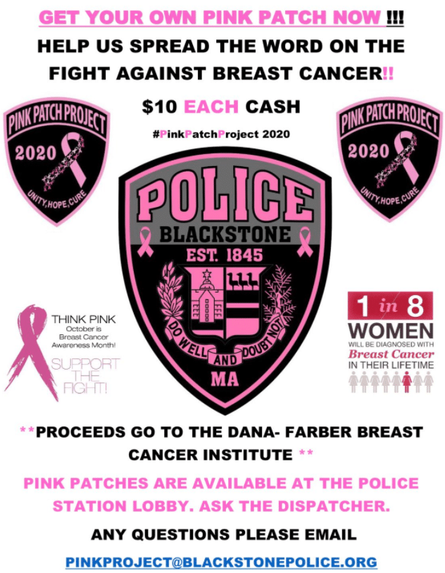 Community members can also purchase a patch through the end of October at the Blackstone Police Department, 15 St. Paul St. Patches cost $10 and can be purchased with cash. All proceeds benefit the Dana-Farber Cancer Institute.