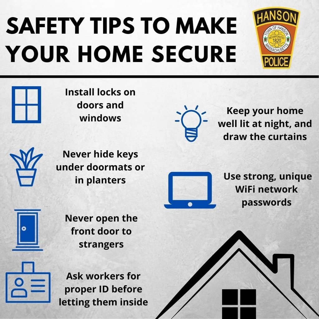 Hanson Police encourage residents to take the following steps, courtesy the Commonwealth of Massachusetts’ Executive Office of Public Safety and Security, as a way to combat common home security threats: