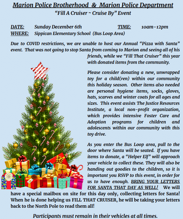 The Marion Police Brotherhood will be hosting the drive-thru event to benefit the Justice Resources Institute, a local non-profit organization which provides foster care and adoption services for children and adolescents in the community.