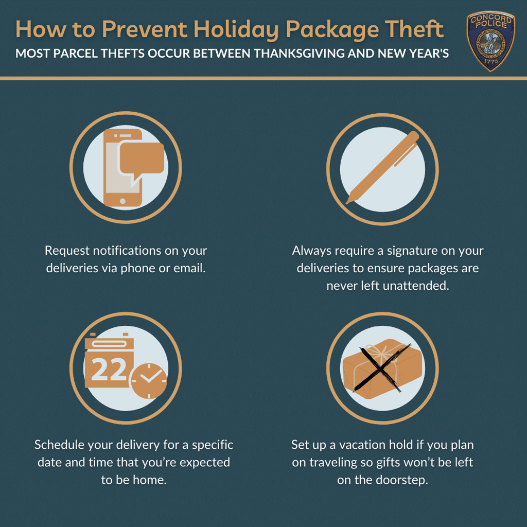 CONCORD — With the holiday season approaching, Chief Joseph O’Connor and the Concord Police Department would like to provide tips for how to prevent theft for residents expecting package deliveries in the coming weeks.