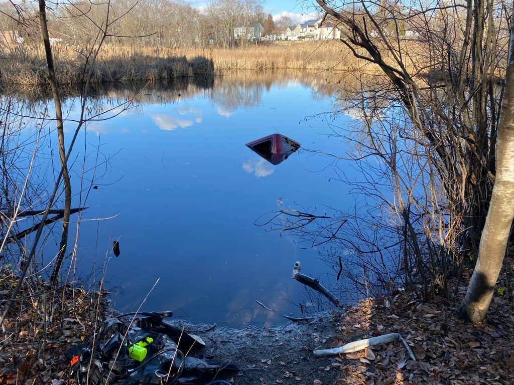 At 8:55 a.m., Stoneham Police and Firefighters were dispatched to Doleful Pond off Tedford Road after receiving a report from a 911 caller about a Jeep Wrangler in the pond. Upon arrival, first responders activated the Stoneham Fire and Police Dive Team, which searched the area of the wreck and determined that there was nobody inside the vehicle.