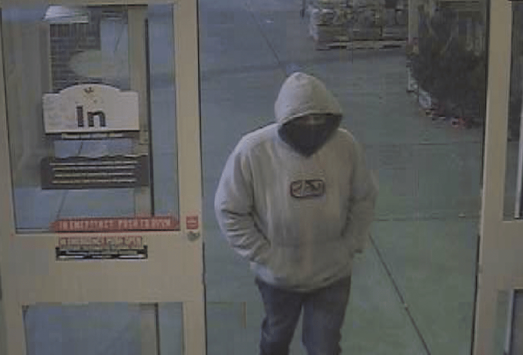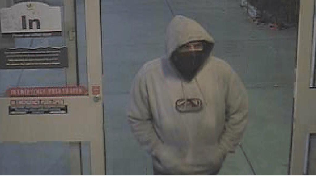 The suspect is described as a white male in his 30s or 40s and wearing a grey hooded sweatshirt, jeans, work boots and a maroon mask.