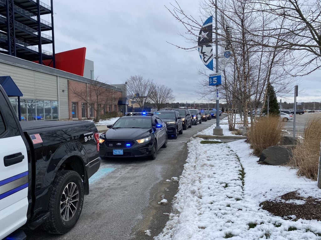 Local police officers from the state’s 351 cities and towns convoyed in police cruisers and other police vehicles to Gillette Stadium to retrieve their buckets. Each bucket contains a coat, masks, hand sanitizer and snacks that will be distributed to veterans in local officers’ cities and towns. Police officers from across the state will then give out the buckets as a way to engage and connect with homeless veterans in their communities.