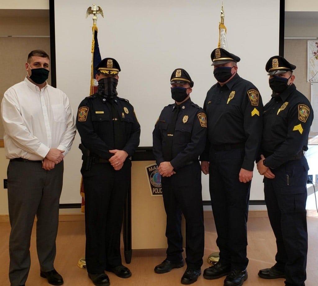 Sgt. Jeffrey Habicht was promoted to the rank of lieutenant and Officers Larry C. Savery and Sean Day were each promoted to the rank of sergeant. All three were appointed to their new ranks during the virtual Marion Board of Selectmen meeting on Tuesday, Jan. 19.