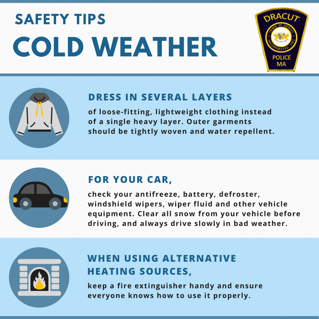 The Dracut Police Department also wishes to share the following tips from the CDC to help keep residents safe in cold weather situations and conditions.