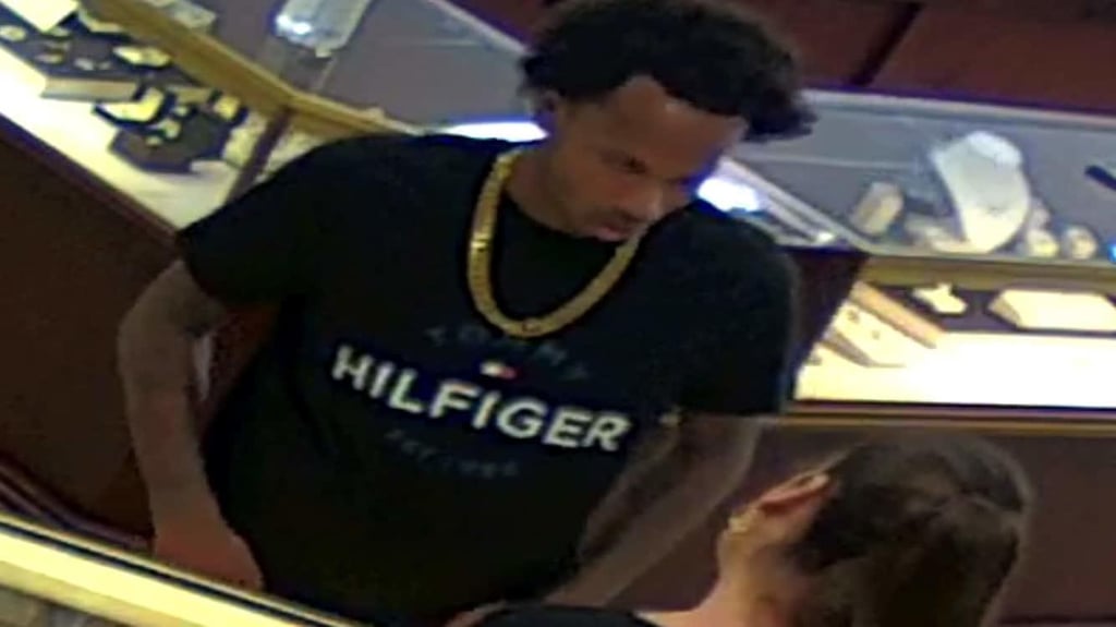 Upon the initial investigation, Officers learned that a man entered the store, asked to see a diamond necklace, then fled the store with it. The suspect is believed to have entered a waiting dark-colored two-door sports coupe with very dark tinted windows. The vehicle bore an out-of-state license plate with an unknown registration.
