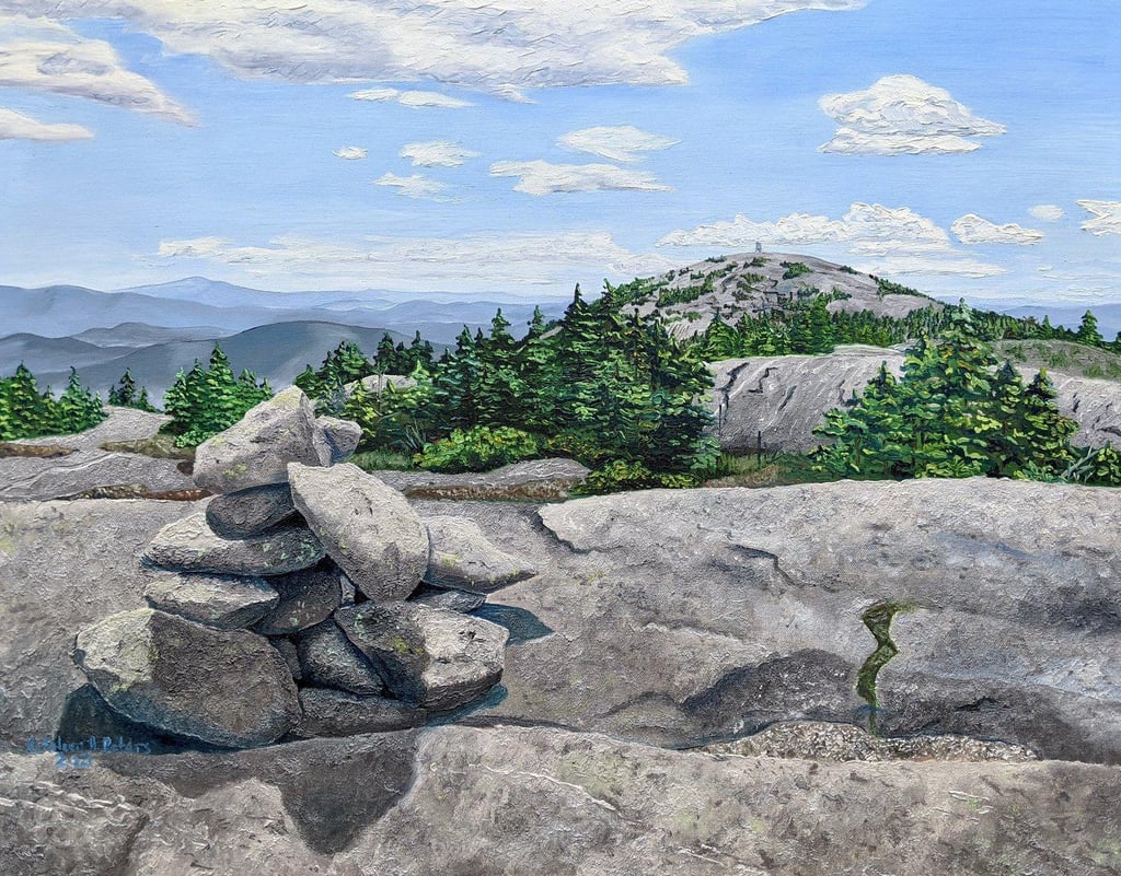 “A Cairn of Hope,” by Kathleen Peters of Canaan, earned second-place honors in the online J. Mane Gallery Art Exhibition in the Landscapes category. The painting portrays vistas on the summit of Mt. Cardigan in Orange, and a cairn. The painting symbolizes the importance of peacefulness and patience in trying times.