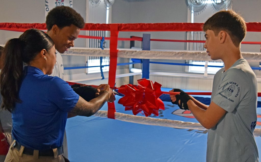 Thanks to donations from the Officer Sean A. Collier Memorial Fund, a grant from the state Executive Office of Public Safety and Security’s Shannon Community Safety Initiative, and numerous community partners, the new facility includes a new, full-sized boxing ring, new training equipment, and new gym equipment.