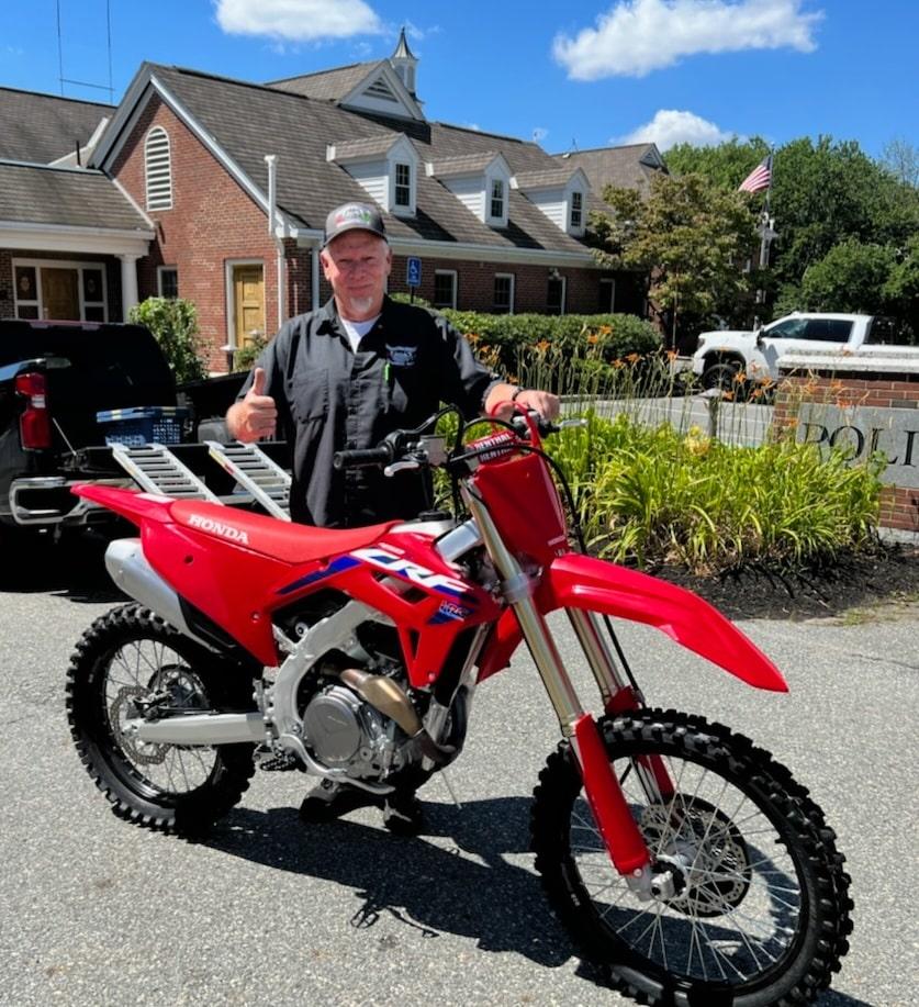 The owner of North Reading Motorsports picked up the second recovered bike at the North Reading Police station on Wednesday, July 13. (Photo Courtesy North Reading Police Department)