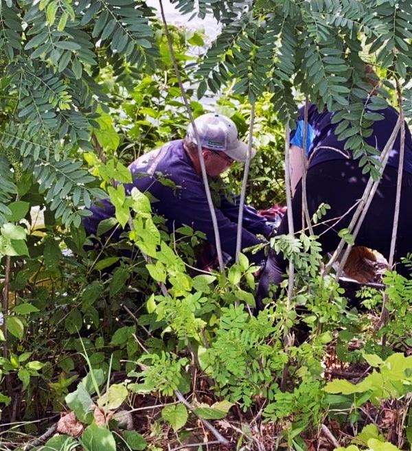 Pierce entered the river to prevent the eagle from fleeing that direction, and Provencher was able to capture the bird using a long net and some blankets and towels. Pierce and Provencher then worked together, in thick brush, to get the eagle out of the net and into an animal crate without further injury, all while wearing thick gloves and taking precautions to protect themselves from the eagle’s potentially dangerous talons and beak.