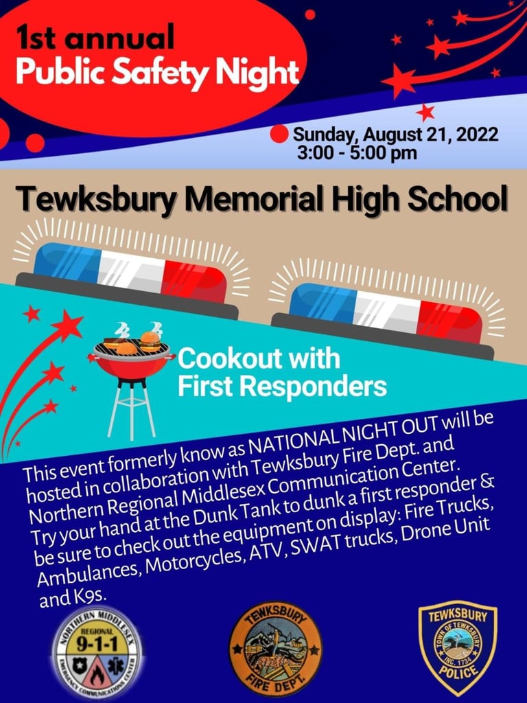 The Tewksbury Police Department, in collaboration with Tewksbury Fire and the Northern Regional Middlesex Communication Center (NRMCC), is hosting a cookout for residents and community members.