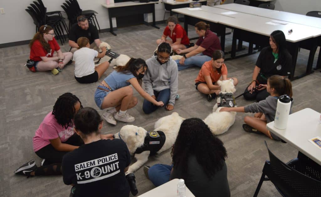 On Monday, the campers received a visit from Golden Opportunities for Independence (GOFI) comfort dogs and a state police K-9, including Cooper from Northeastern University, Willow from the Johnson Middle School in Walpole, Lucy from the Hanson Police Department, Harper from the Randolph Police Department, Derby from the Salem Police Department, Roger from Babson College, and Massachusetts State Police Trooper Christina Cavagnaro and K-9 Thor.