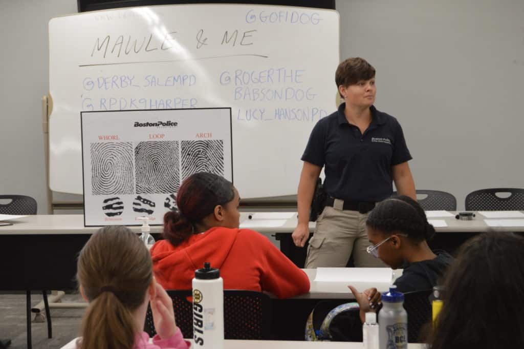 Campers also heard from women law enforcement leaders from around the region through a panel discussion, including BPD Bureau of Professional Development Superintendent Nora Baston, BPD Family Justice Center Capt. Detective Therese Kozmiski, Endicott College Police Chief Kerry Ramsdell, Norfolk County Sheriff’s Department Superintendent Danielle Frane, BPD Crimes Against Children Unit Sgt. Detective Pamelia Harris, BPD B2 Community Service Office Sgt. Bernadette Sullivan, BPD Officer Shayna Lyons, BPD Bureau of Community Engagement/GROW Officer Jamila Gales, BPD Domestic Violence Unit Detective Stephanie O’Sullivan, BPD Civil Rights Unit Detective Lakenya Webster, BPD Bomb Squad Sgt. Christine Carr, BPD Cadets Leonela Nunez and Gabriella Bashline, as well as an FBI Special Agent and ATF Special Agent.