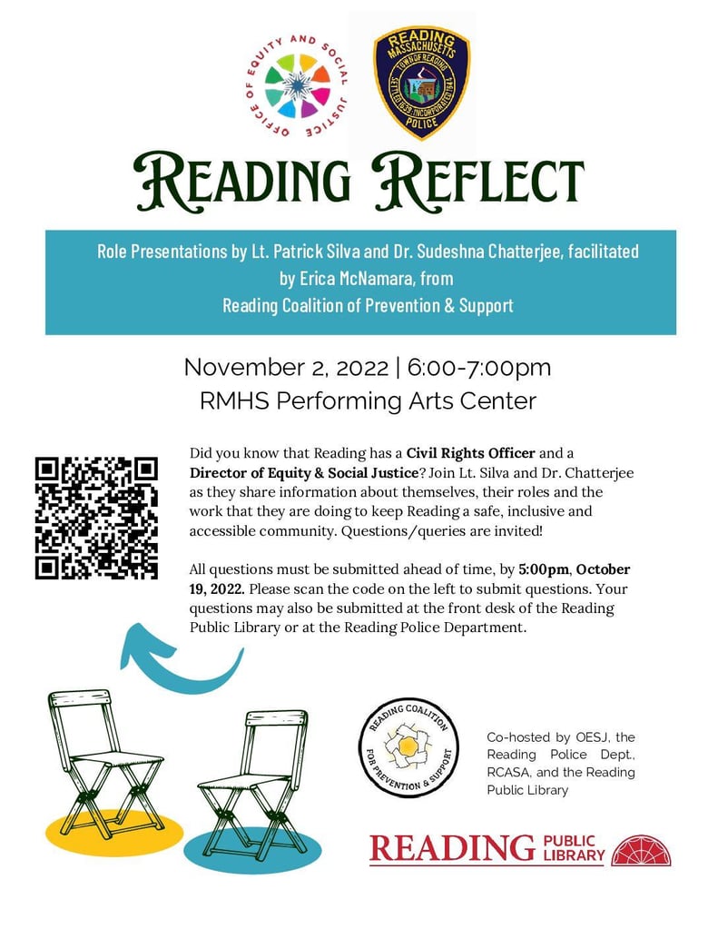 READING — Chief David J. Clark would like to invite residents to ‘Reading Reflect,’ a community conversation hosted by the Reading Police Department and the Office of Equity and Social Justice, in collaboration with the Reading Coalition for Prevention and Support and the Reading Public Library.