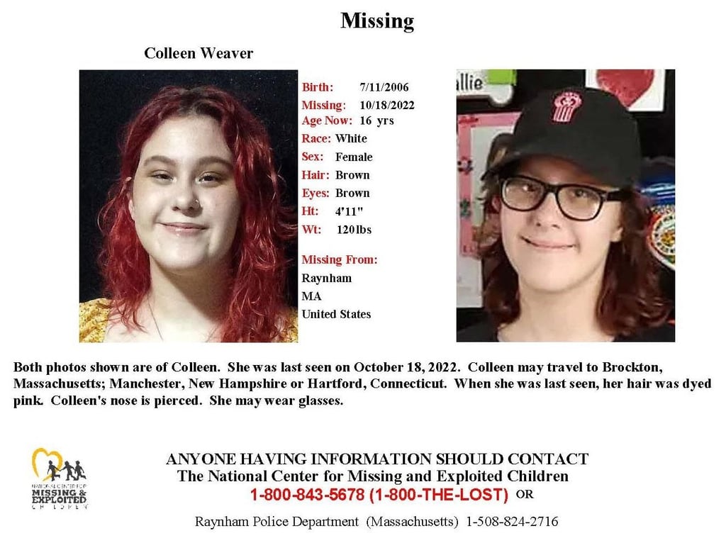 Colleen is described as 5-feet-tall, weighing approximately 120 pounds, with red/pink hair. It is believed that she was wearing black glasses and possibly a sweatshirt and leggings. Anyone with information on her whereabouts is asked to call the Raynham Police Department at 508-824-2717.