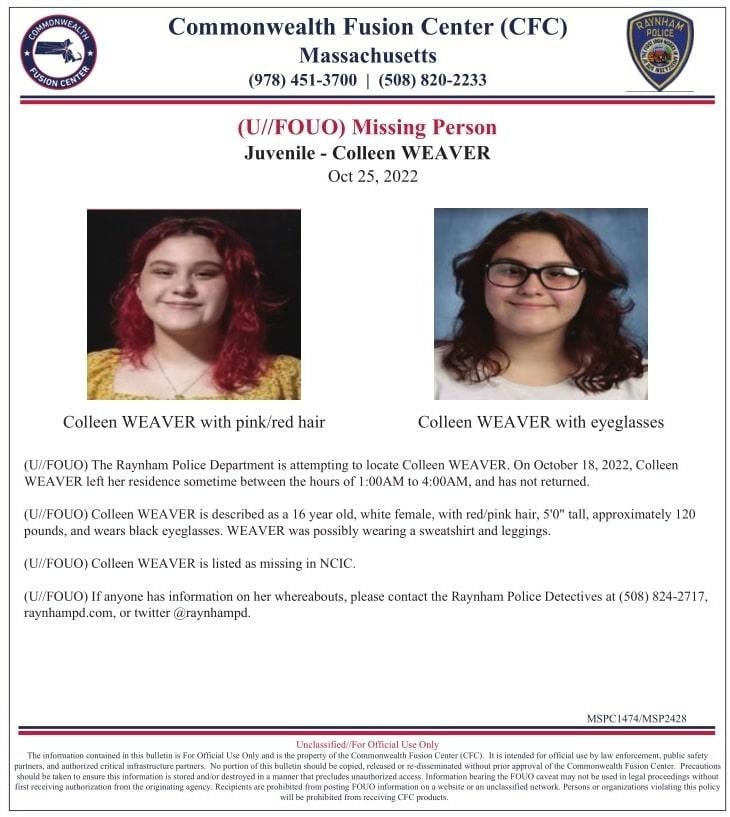RAYNHAM — Chief James Donovan reports that the Raynham Police Department is providing an update on the search for 16-year-old Colleen Weaver.