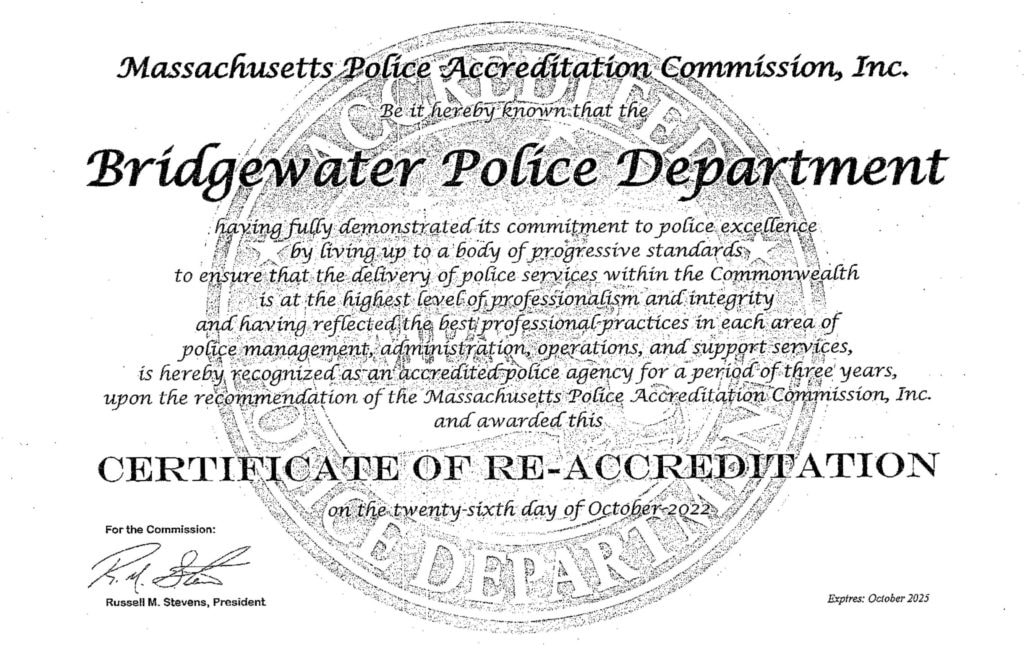 Accreditation must be renewed every three years and, following this year’s renewal, the Bridgewater Police Department will be up for re-accreditation again in October 2025.