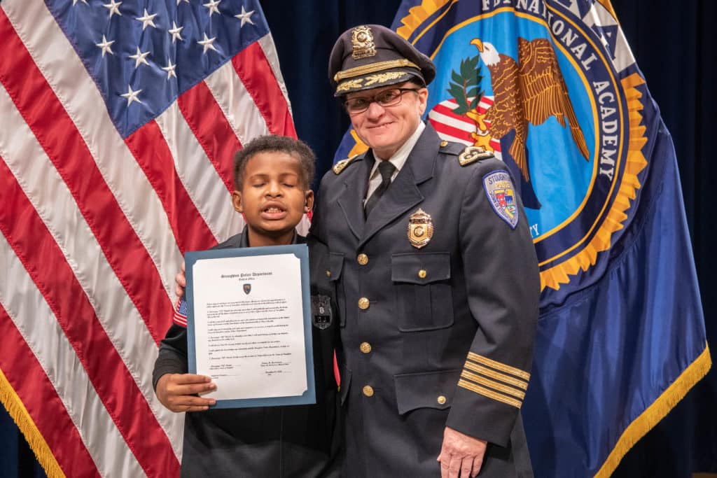 STOUGHTON — The Stoughton Police Department welcomed a new member to its ranks this week, 11-year-old Devarjaye “DJ” Daniel, who participated in an honorary swearing-in ceremony with Chief Donna McNamara at the FBI National Academy in Quantico, Virginia.