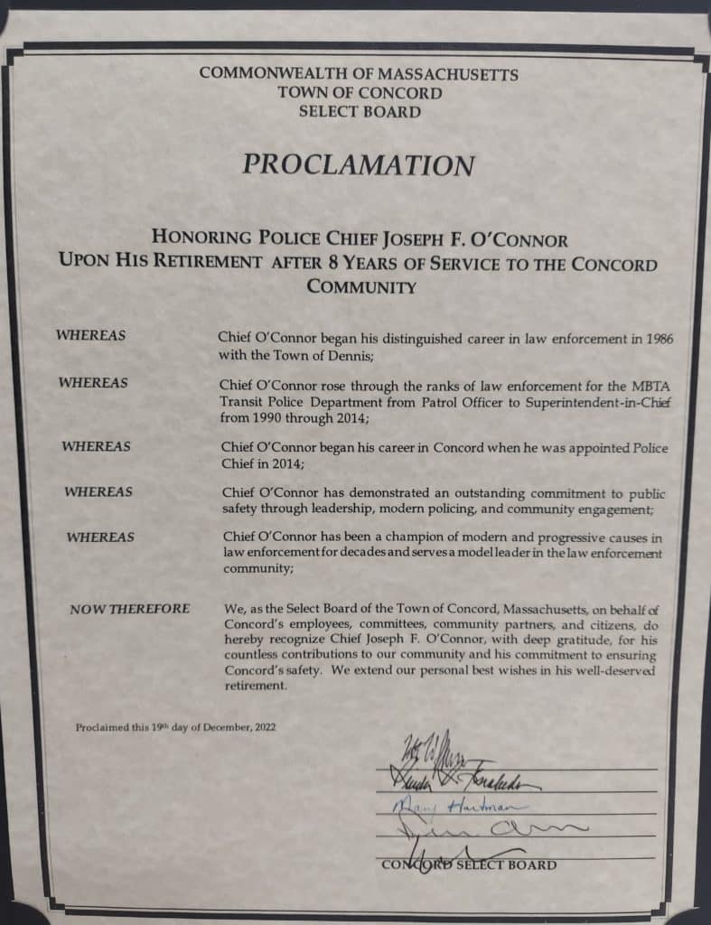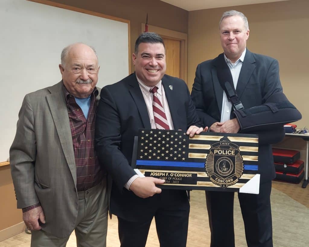Select Board Member Henry Dane presented a proclamation thanking O’Connor for his service. Detective Keith Harrington of the Concord Police Relief Association presented a specially designed wall hanging bearing the Concord police badge.