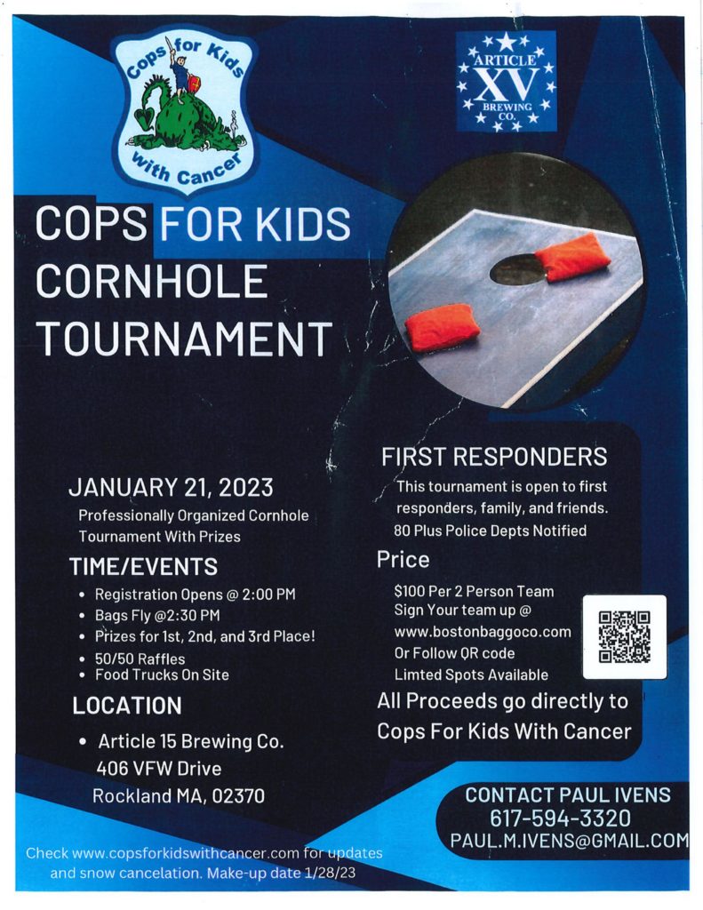 Cops for Kids with Cancer will be hosting a cornhole tournament on Saturday, Jan. 21, at Article 15 Brewing Co., 406 VFW Drive, Rockland, for first responders, family, and friends to raise money for the organization. Registration for the event begins at 2 p.m. and the tournament will begin promptly at 2:30 p.m.