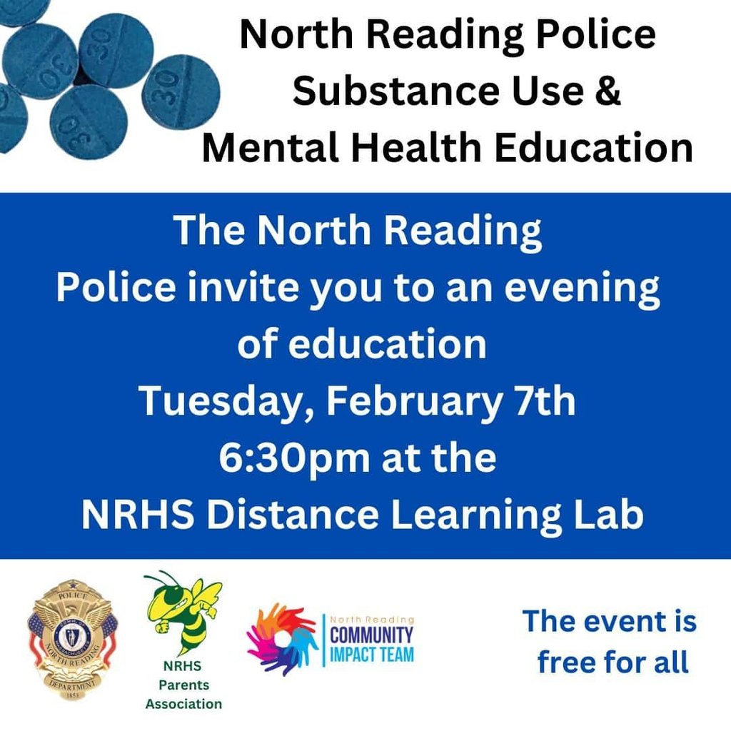 The evening will be presented by North Reading Police Detectives and focus on emerging trends such as fentanyl use, counterfeit pills, “gateway” substances, and local information.