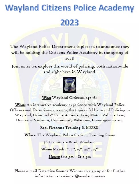 WAYLAND — Acting Chief Ed Burman is pleased to announce that residents can now sign up for the Wayland Police Department’s Citizens Police Academy this spring.