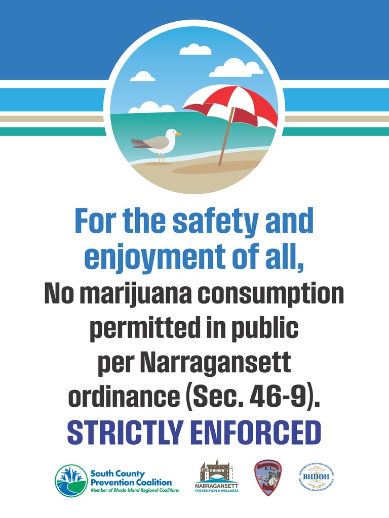 The signs inform visitors that marijuana consumption is not permitted in public in Narragansett, per town ordinance.