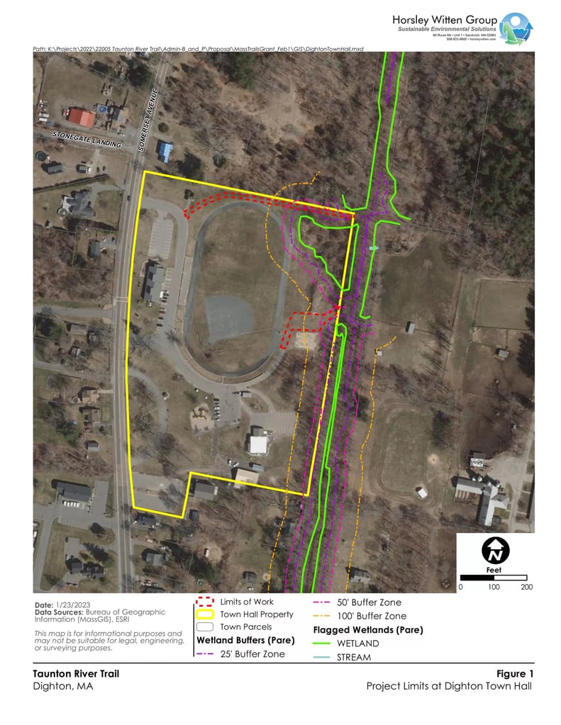 With Dighton’s Town Hall Complex abutting the Taunton River Trail (TRT), the area provides an appealing, publicly accessible connection opportunity to the planned Taunton River Trail and related planned improvements to Sweets Knoll State Park. Anticipated project efforts seek to complement ongoing TRT design and permitting processes underway by the state Department of Conservation and Recreation and the Horsley Witten Group.
