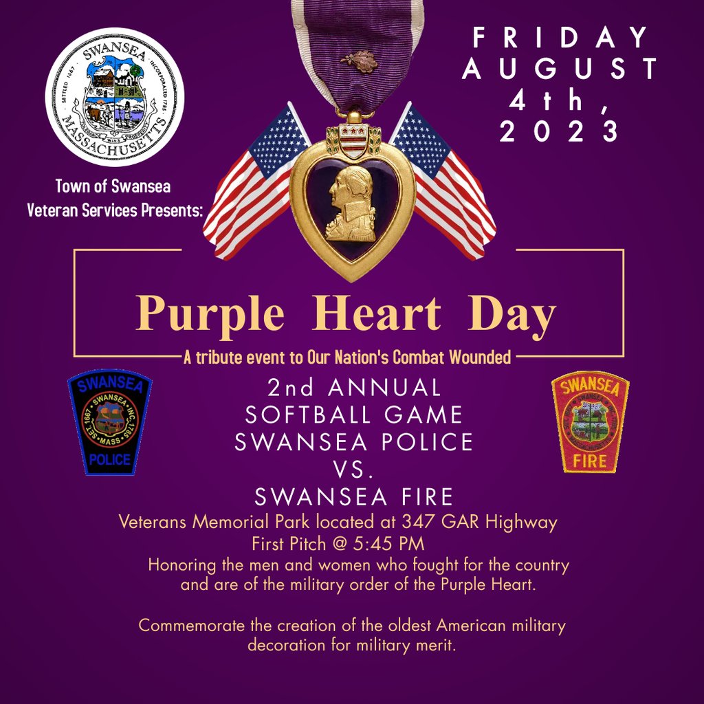 Purple Heart Day will be recognized locally with a softball game between Swansea firefighters and police officers.