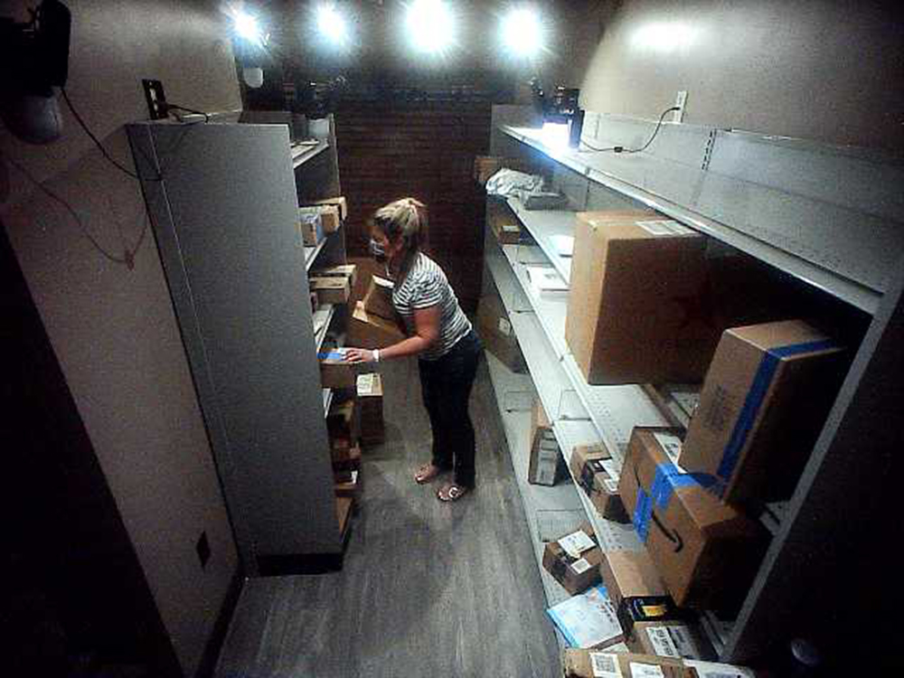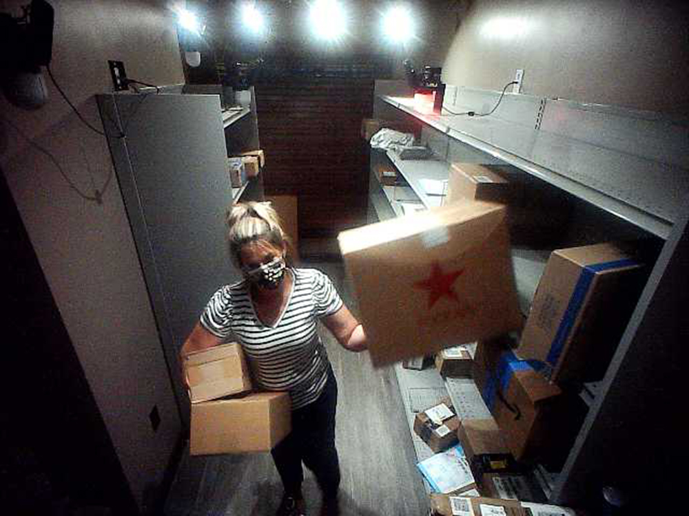 An investigation and review of surveillance video determined that a female suspect entered the secure room when residents held the door open for her. The suspect then took several large packages and filled a bag with smaller packages, making multiple trips to her car.