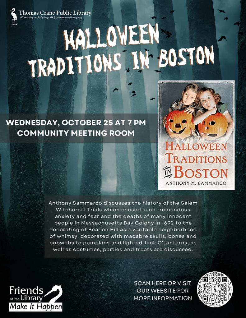 Community members are invited to join Friends of the Thomas Crane Public Library as Best Selling Author and Historian Sammarco presents his book “Halloween Traditions in Boston.”