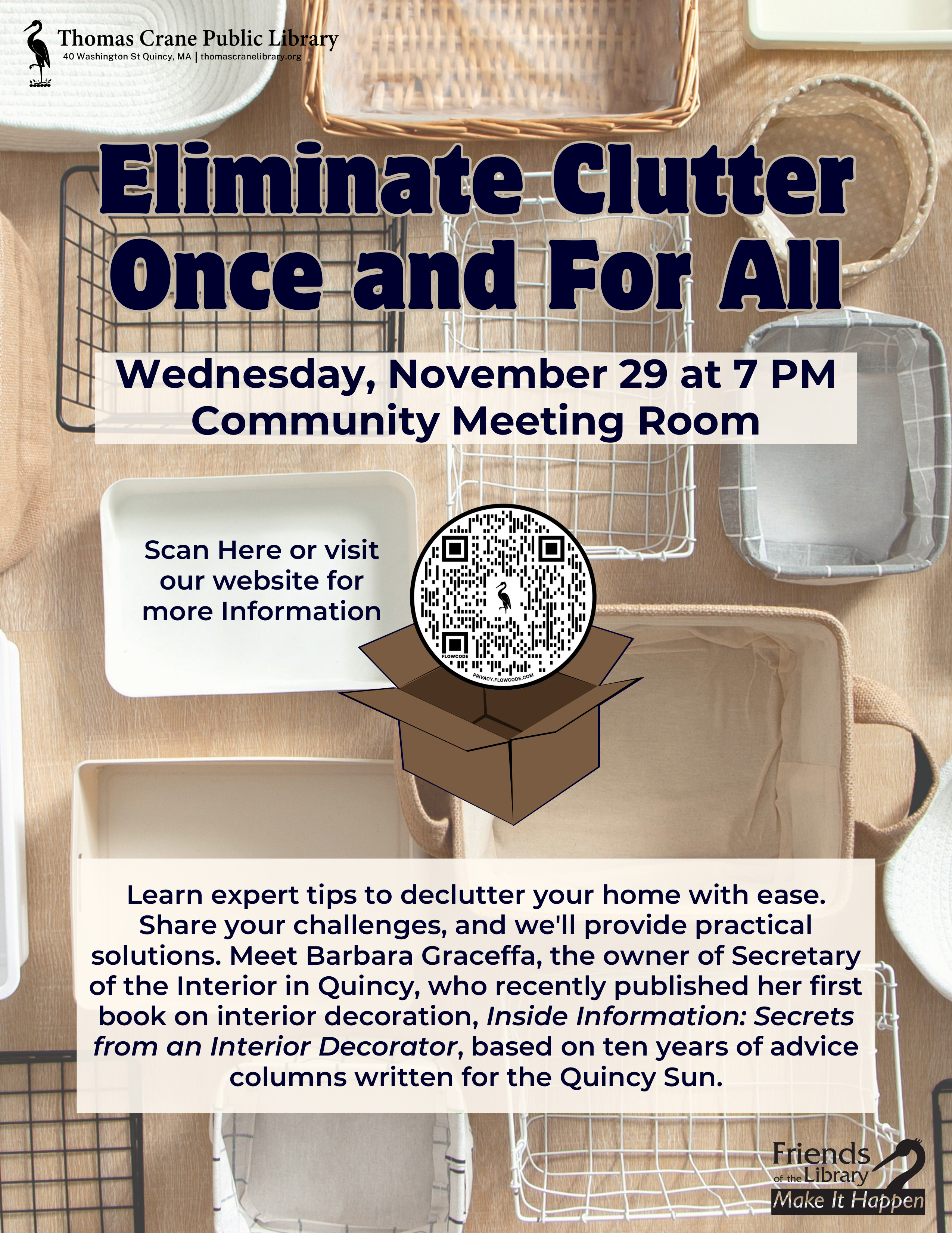 On Wednesday, Nov. 29, the Thomas Crane Public Library will host an informational home decluttering event, “Eliminate Clutter Once and For All,” led by Interior Decorator and Professional Organizer Barbara Graceffa.
