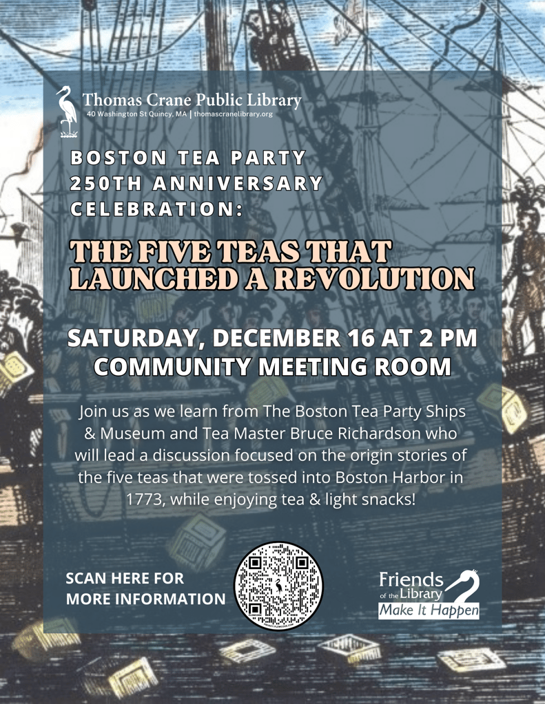Join the Thomas Crane Public Library, The Boston Tea Party Ships and Museum, and Tea Master Bruce Richardson for a virtual discussion on Dec. 16, to celebrate the 250th anniversary of the Boston Tea Party.