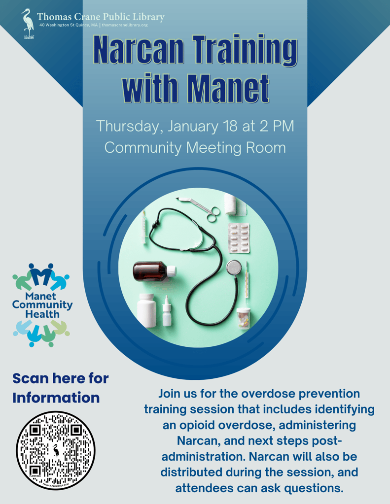 QUINCY — The staff of the Thomas Crane Public Library are proud to present a Narcan Training event with Manet Community Health Center later this month.