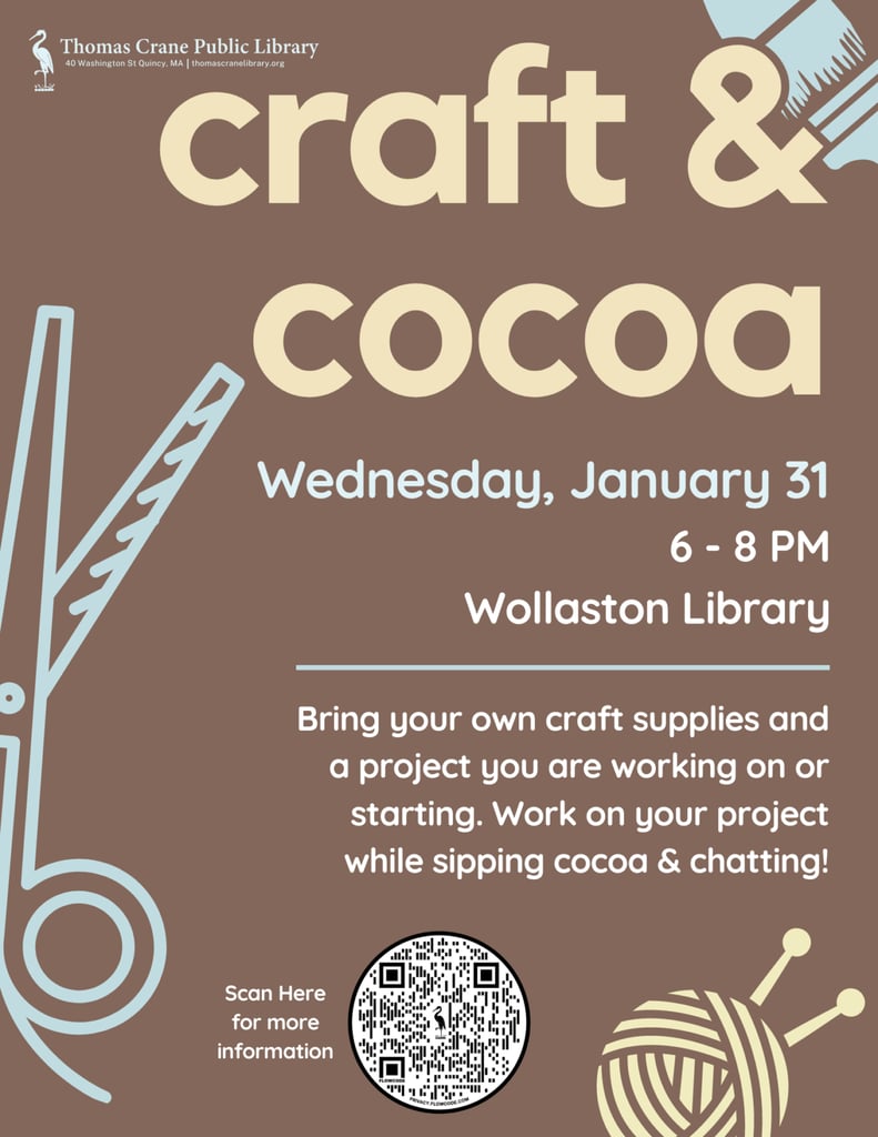 Join members of the Thomas Crane Public Library for crafts and cocoa night at Wollaston Library.