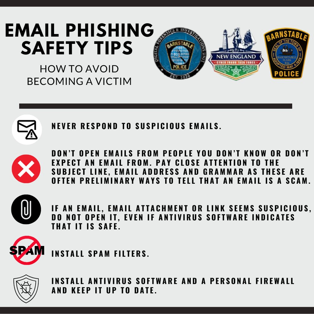 The Barnstable Police Department would like to share the following safety tips from the United States Computer Emergency Readiness Team (US-CERT), which is part of CISA, to help residents avoid falling victim to email phishing scams: