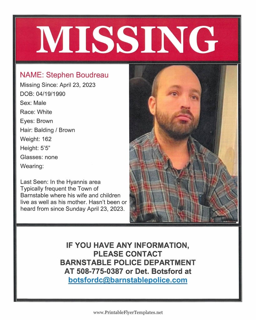 Stephen Boudreau, age 34, of Barnstable, has been missing since Sunday, April 23, 2023. He was last seen in the downtown Hyannis area.