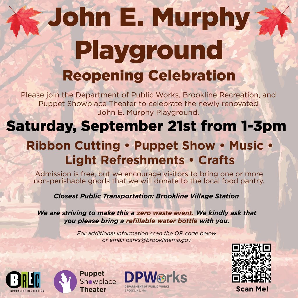 BROOKLINE — The Brookline Department of Public Works (DPW) and Recreation Department invite the community to attend the reopening celebrations of the John E. Murphy Playground and the Margaret E. Robinson Playground this month.