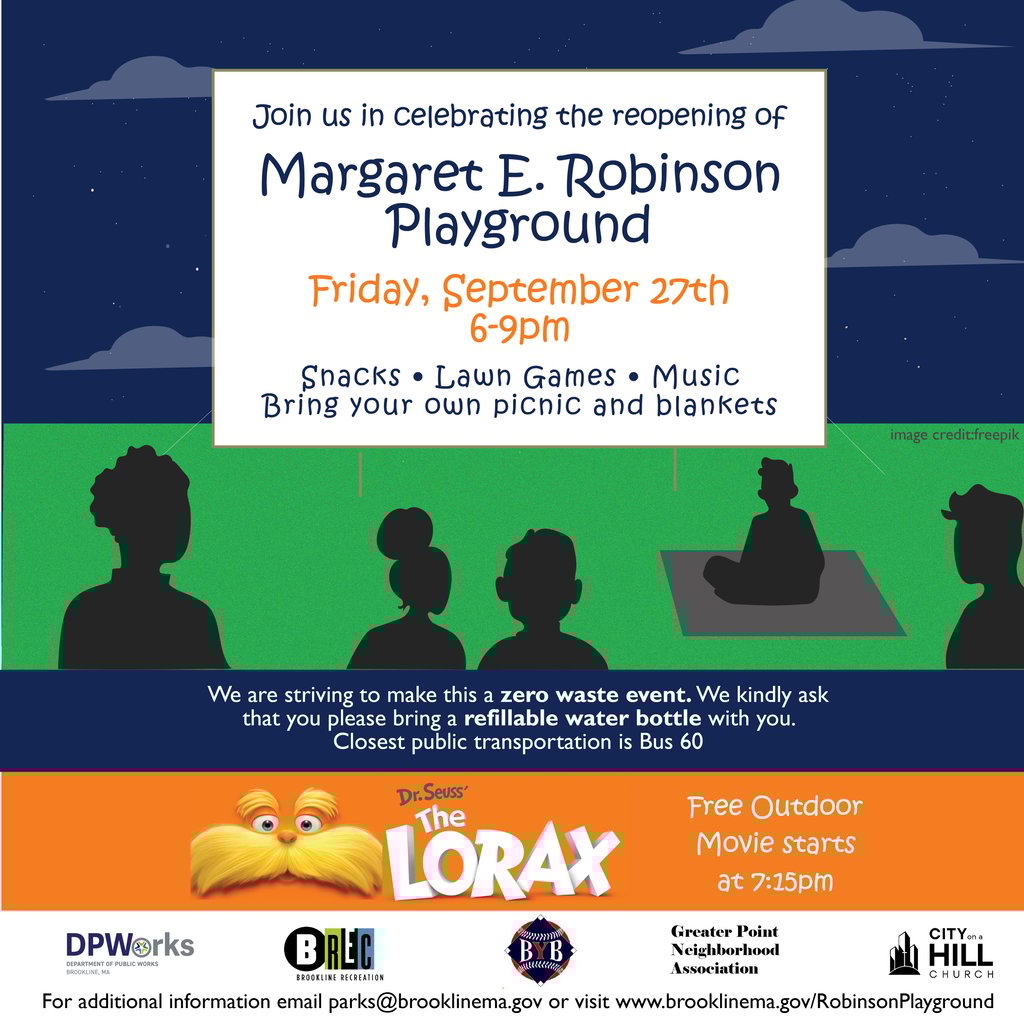 The Robinson Playground reopening celebration — hosted in collaboration with Brookline Youth Baseball, the Greater Point Neighborhood Association, and City on a Hill — will be held on Friday, Sept. 27 from 6-9 p.m., at the Robinson Playground, corner of Cypress and Franklin Street.