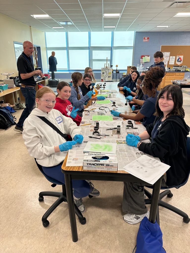 Throughout the day, Cadette Girl Scouts, who are all in 8th grade, rotated between two criminal justice classrooms, where Blue Hills students and their teachers taught them the science behind criminal investigations. They studied chemistry and its applications to trace evidence, the physics of ballistic and blood spatter evidence and biology through exploring DNA.