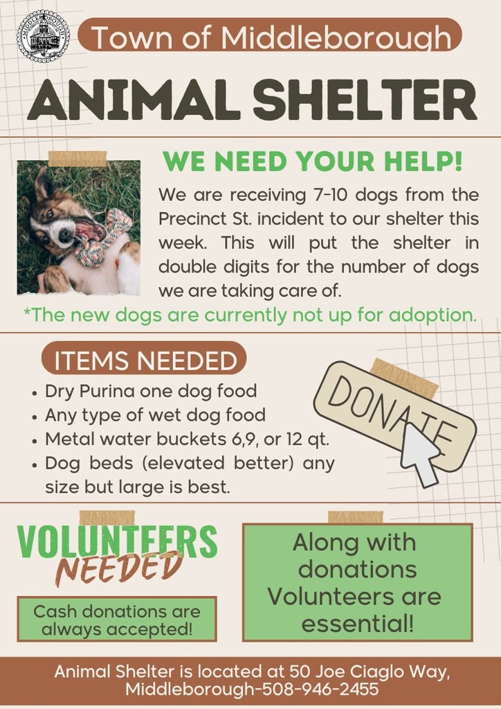 The Middleborough Animal Shelter is located at 50 Joe Ciaglo Way. Donations, including cash, can be delivered in person. To volunteer, call 508-946-2455 or email Animal Control Officer Racicot at kracicot@middleboroughma.gov.