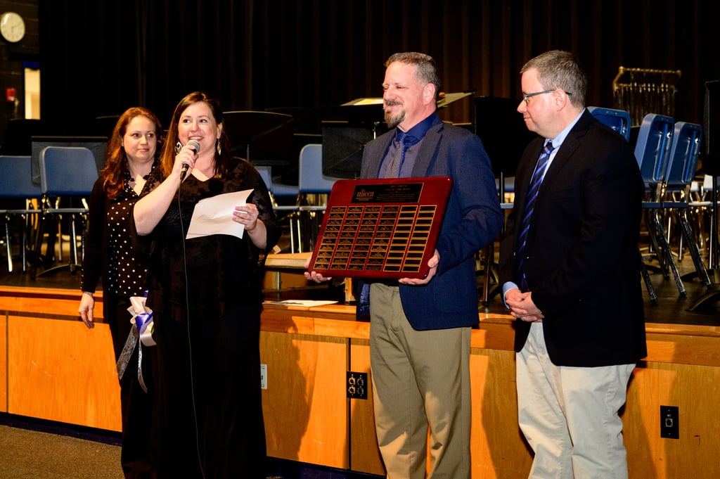 Medway High School Choir Director Ashley Nelson-Oneschuk receives the MICCA Paul Smith Hall of Fame Award during the Festival Preview Concert on Wednesday, March 19. From left to right, MICCA Past President Marie Forte, Ashley Nelson-Oneschuk, MICCA Representative Steven Conant and MICCA President Ryan DeWolfe. (Photo Courtesy Medway Public Schools)