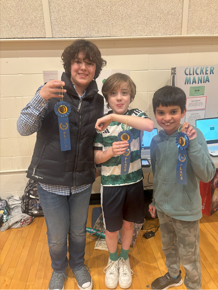 - Fifth-grade students Aidan Zhou, Matthew Oien, and Rowan Farquarson won a blue ribbon for their Coding project, “Tree Hugger AI.”