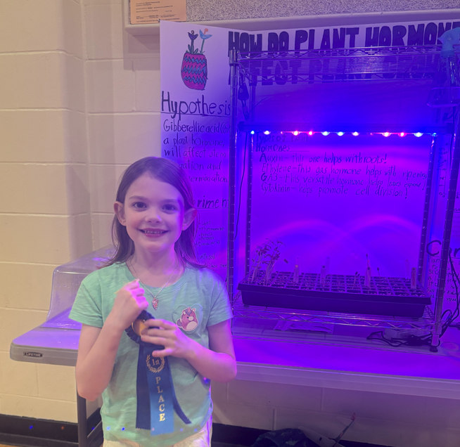 - First-grade student Jolee Woods won a blue ribbon for her project, “How do plant hormones affect plant growth?”