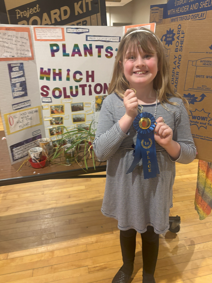 - Second-grade student Sagan Tomasik-Jones won a blue ribbon for her project, “Plants: Which solution is better?”