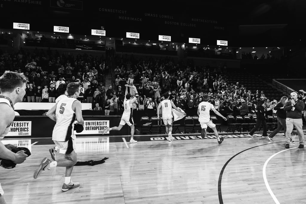 Members of the Franklin High School boys basketball team celebrated with fans in the stands after winning the MIAA Division 1 championship final, defeating Newton North 55-52. (Photo Courtesy Hunter Smith). (Photo Courtesy Hunter Smith)