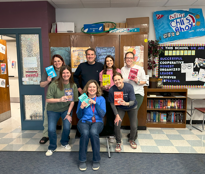 Remington Middle School teachers pose with author Jordan Sonnenblick, showcasing some of their favorite books. (Photo Courtesy Franklin Public Schools)