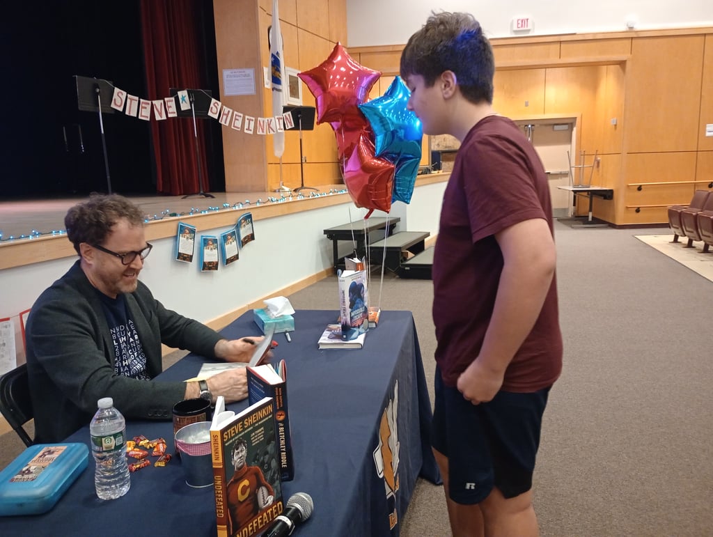A Horace Mann Middle School student meets author Steve Sheinkin. (Photo Courtesy Franklin Public Schools)