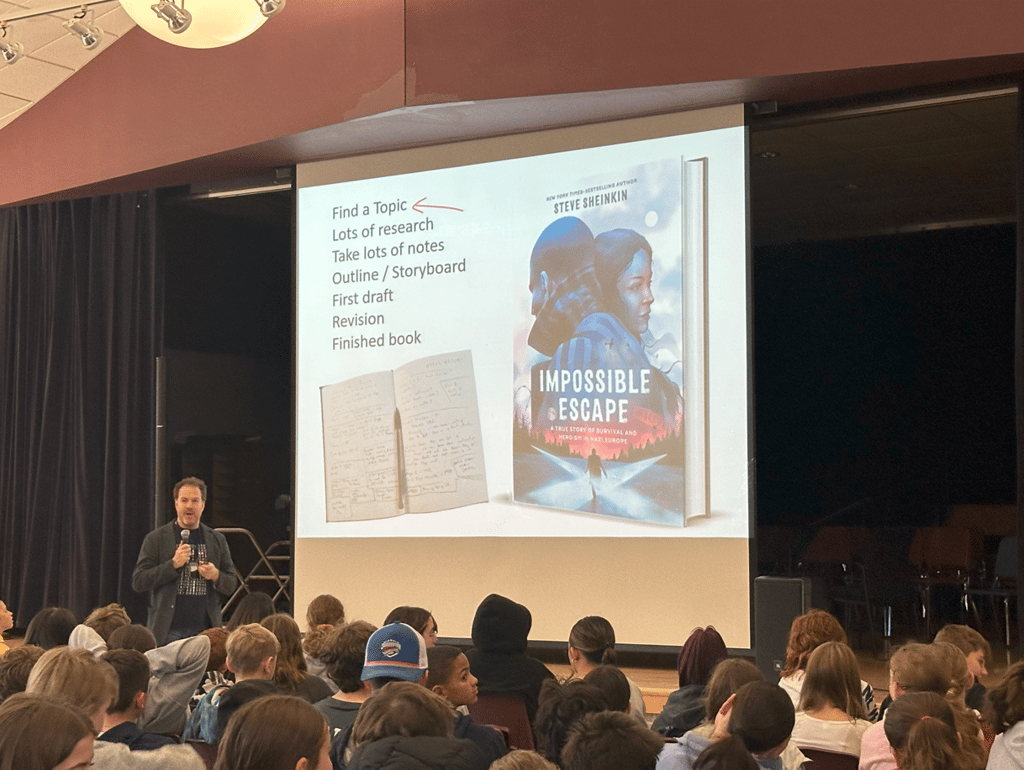 Author Steve Sheinkin presents to the Remington Middle School student body. (Photo Courtesy Franklin Public Schools)